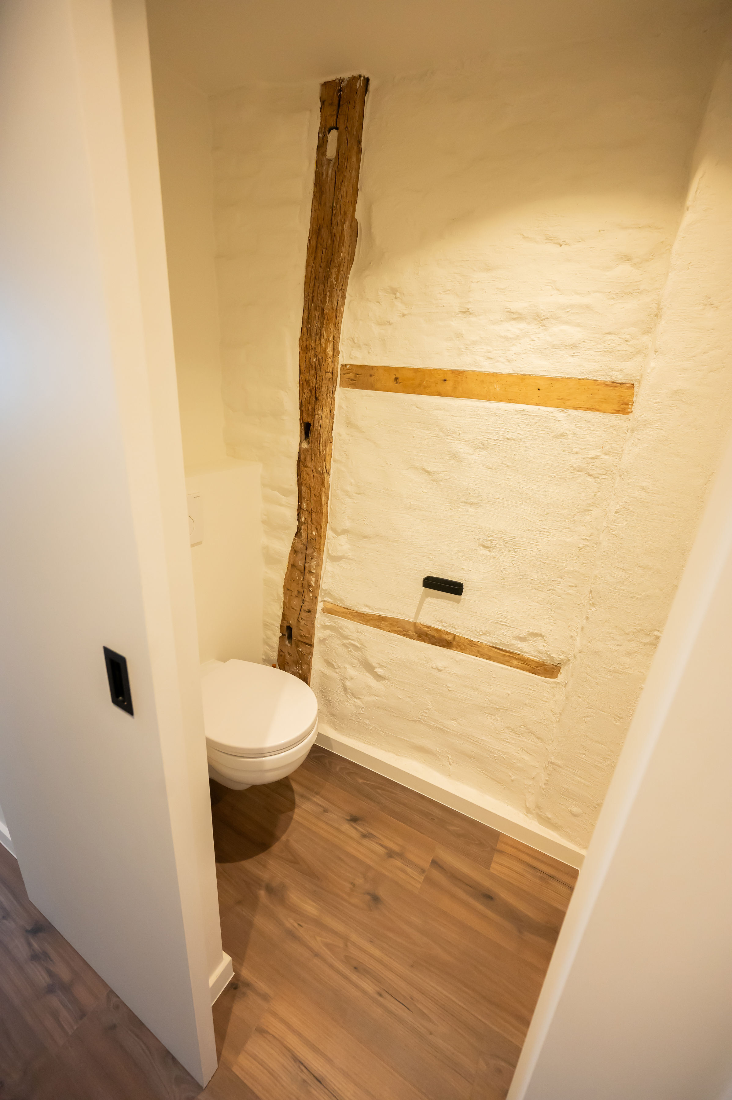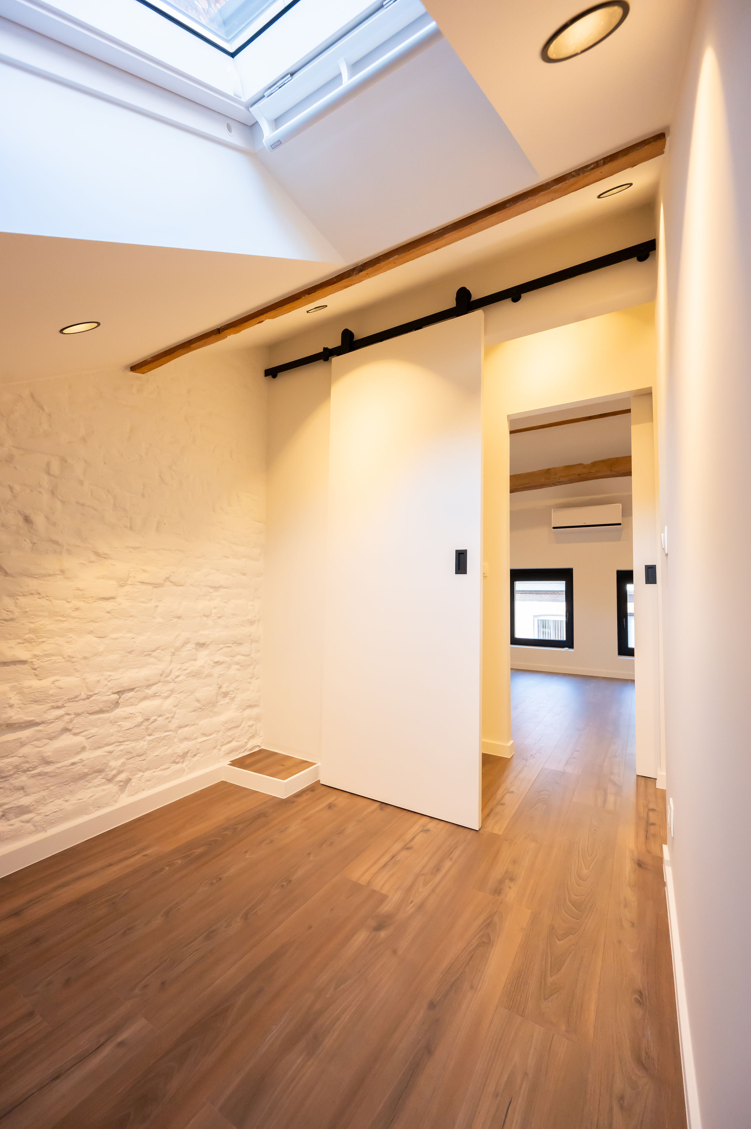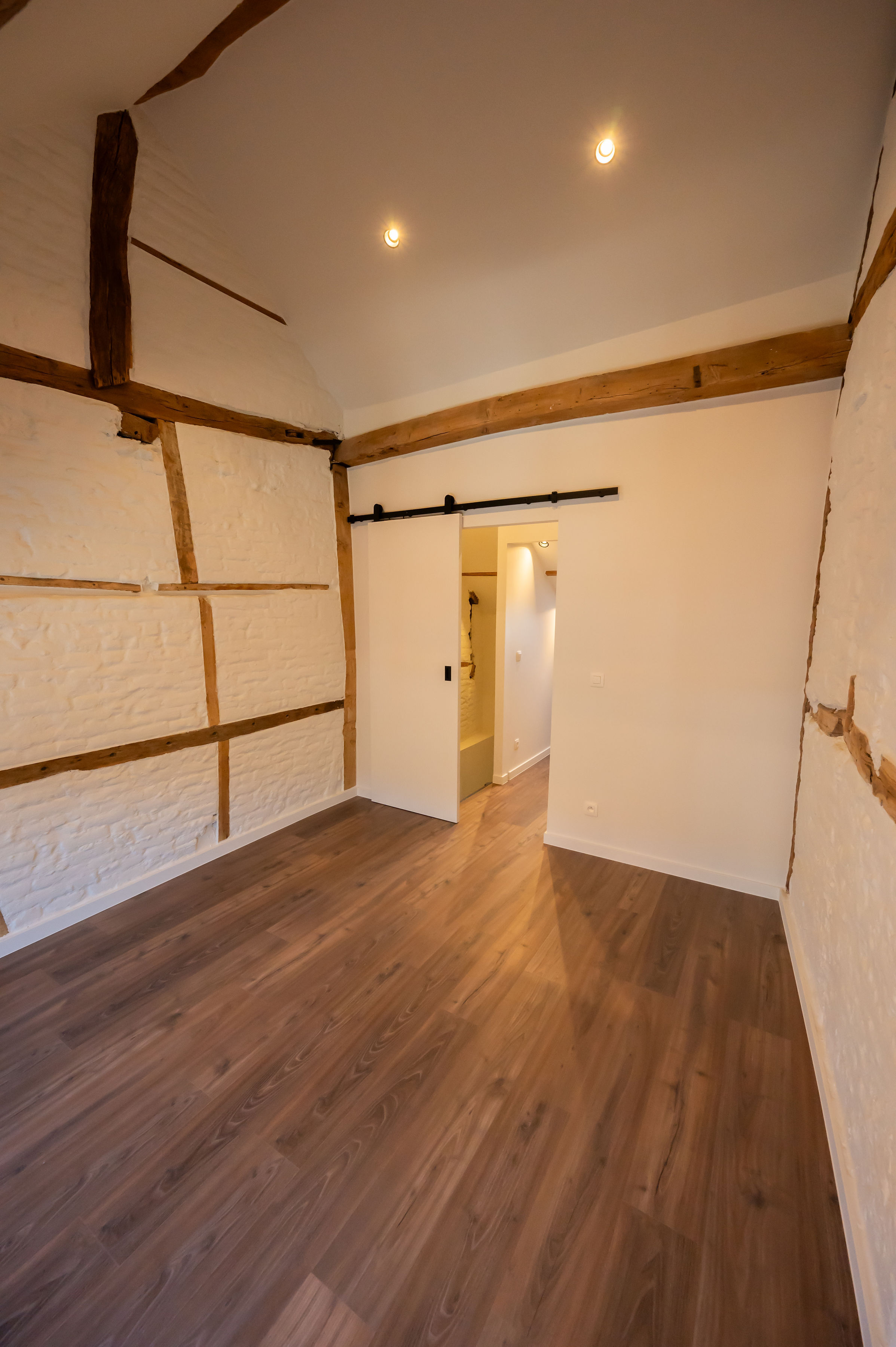 - Moderne accenten en eyecatchers zoals authentieke gerestaureerde elementen, gekaleide originele binnenmuren, gelakte schuifdeuren.