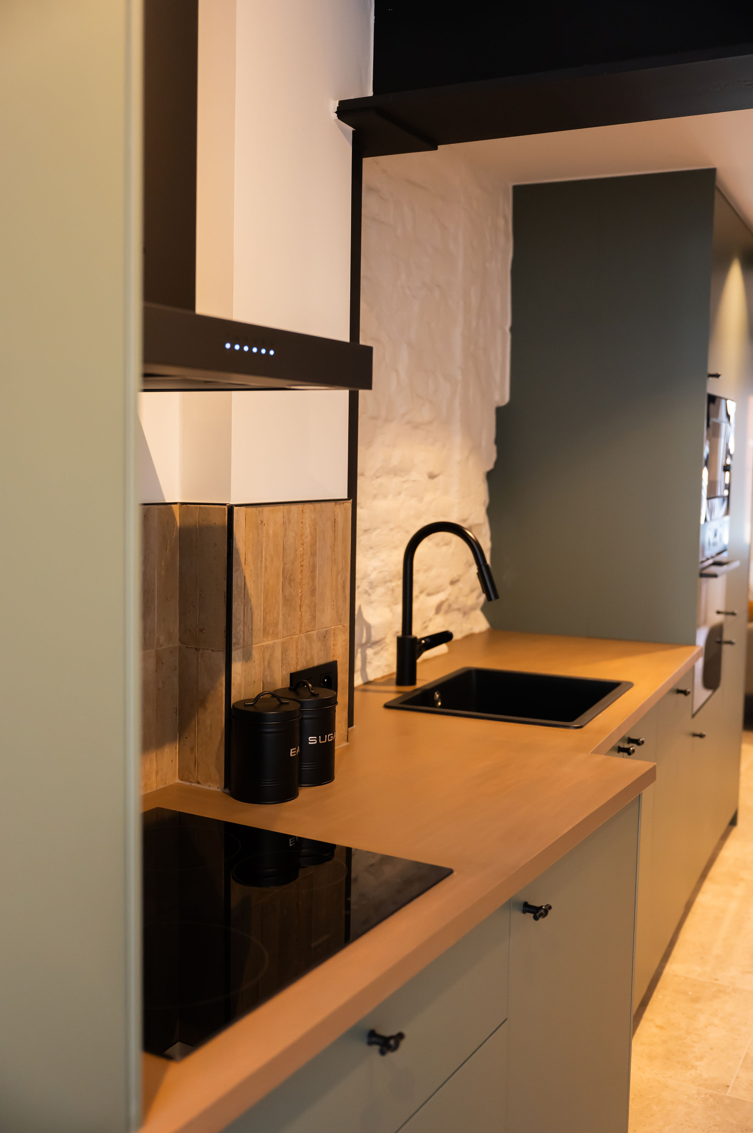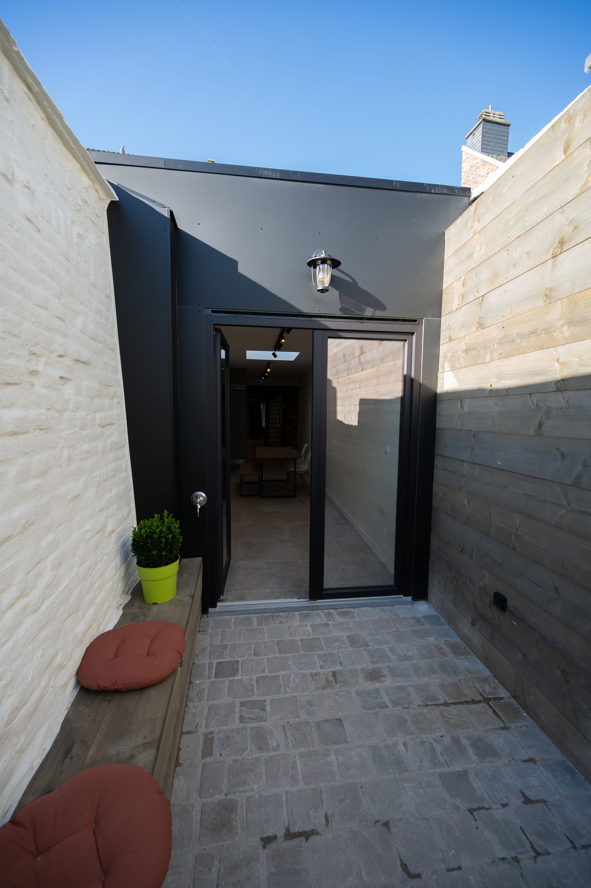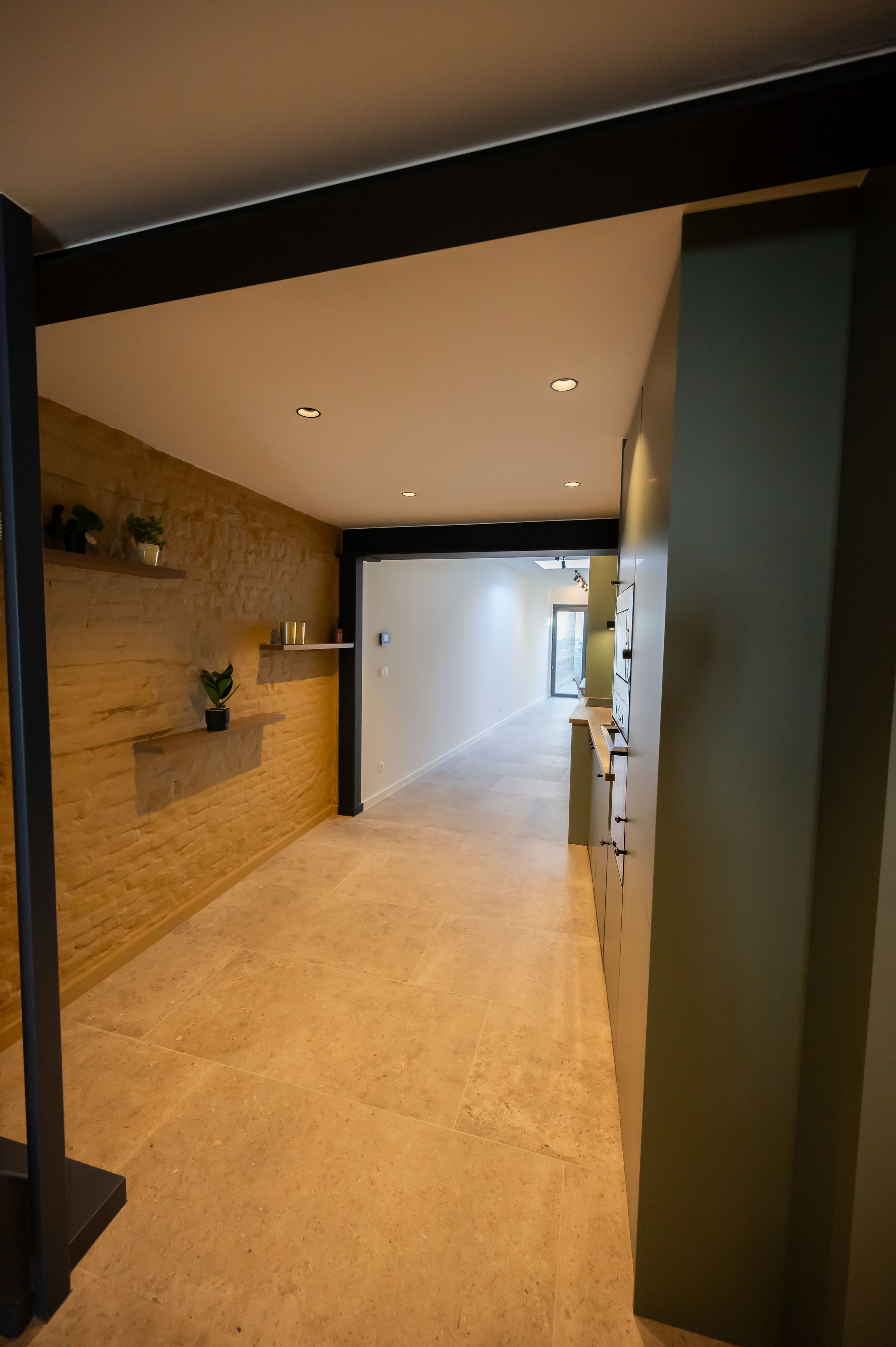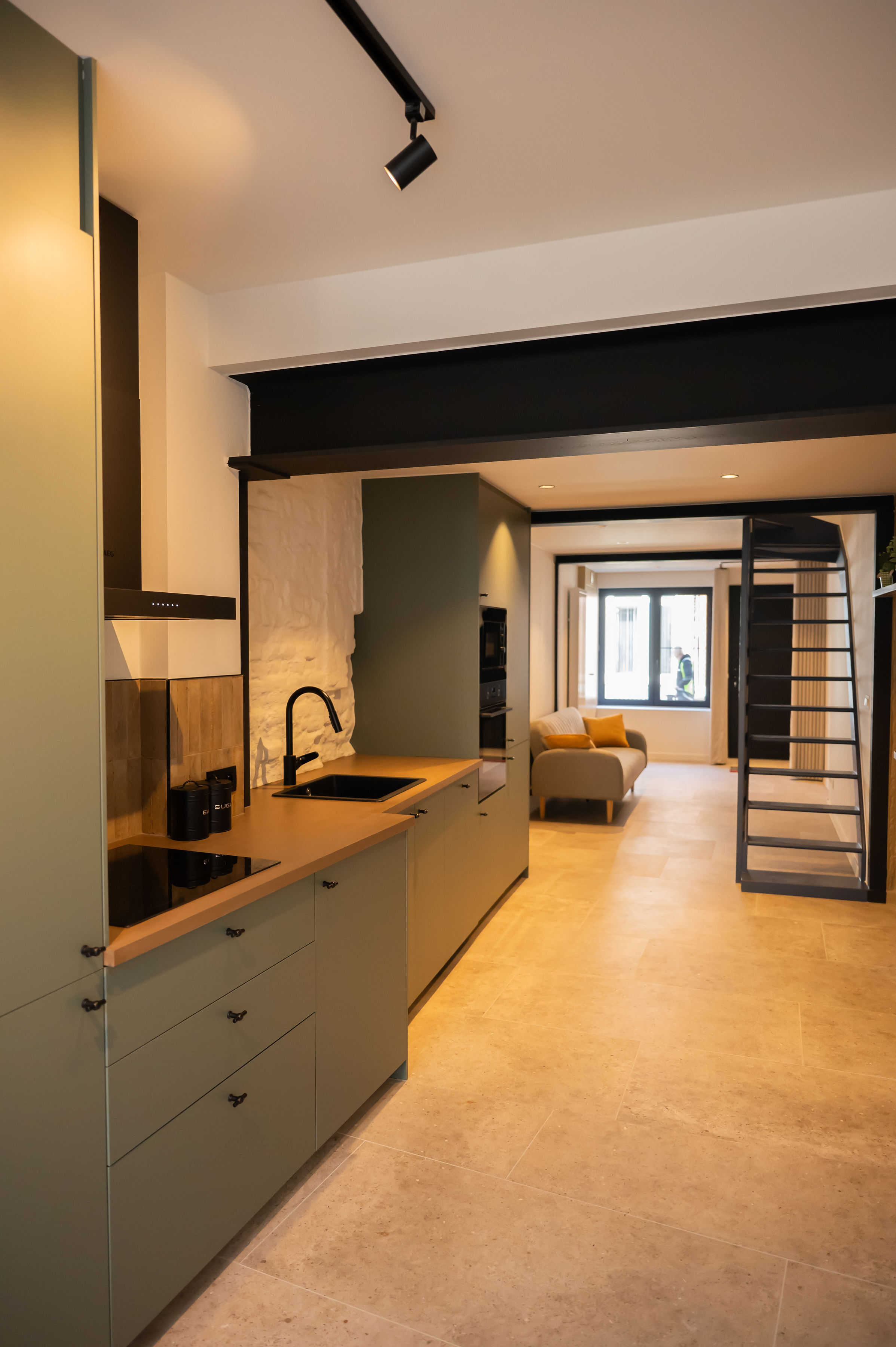 - Moderne accenten en eyecatchers zoals authentieke gerestaureerde elementen, gekaleide originele binnenmuren, gelakte schuifdeuren.