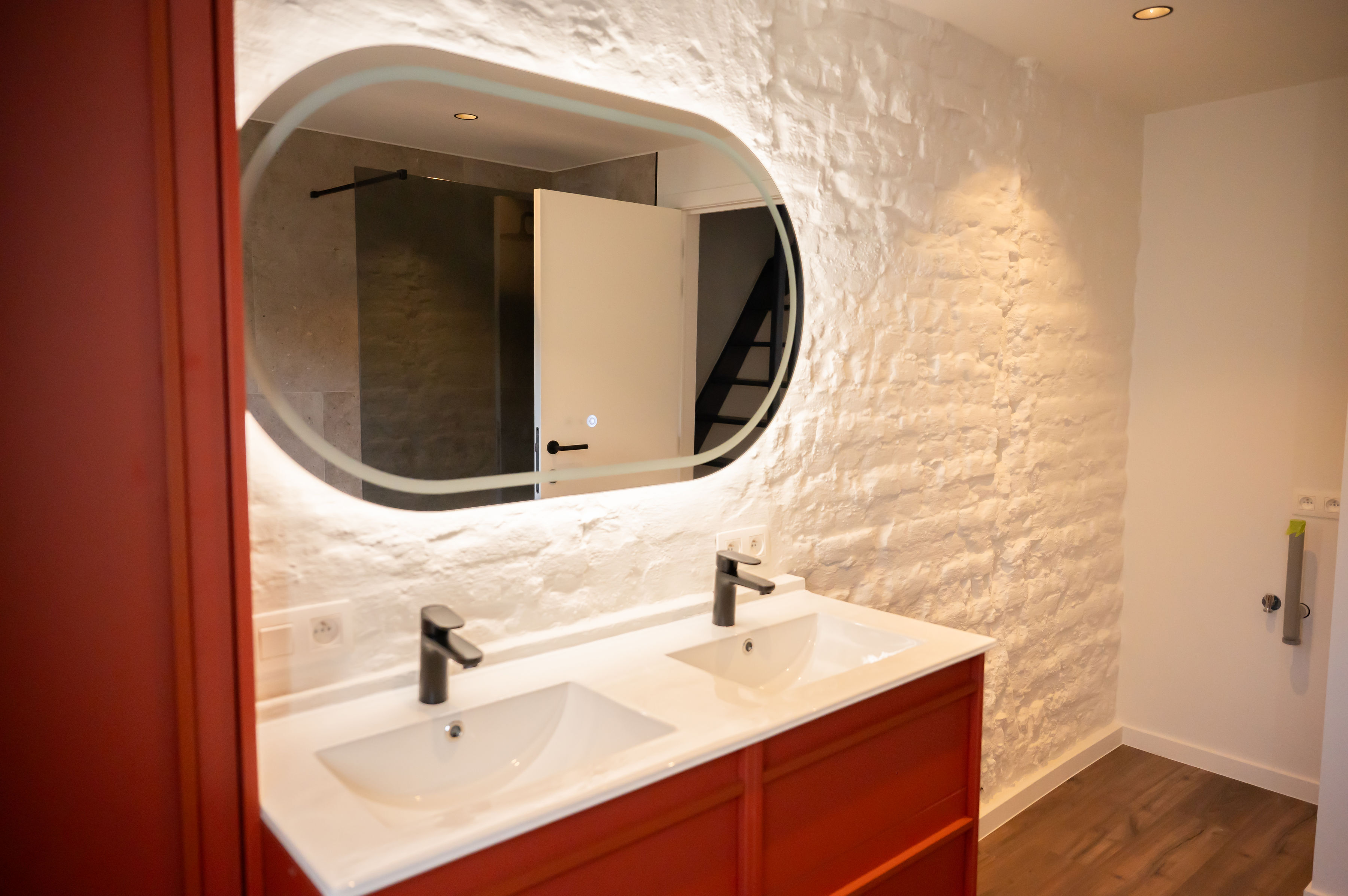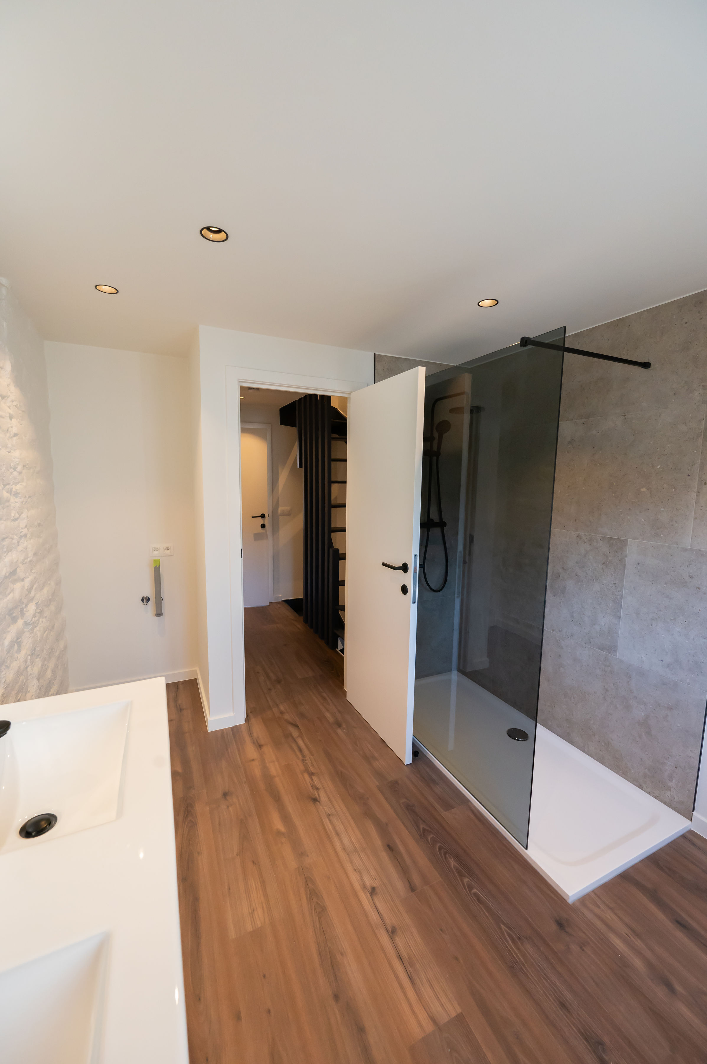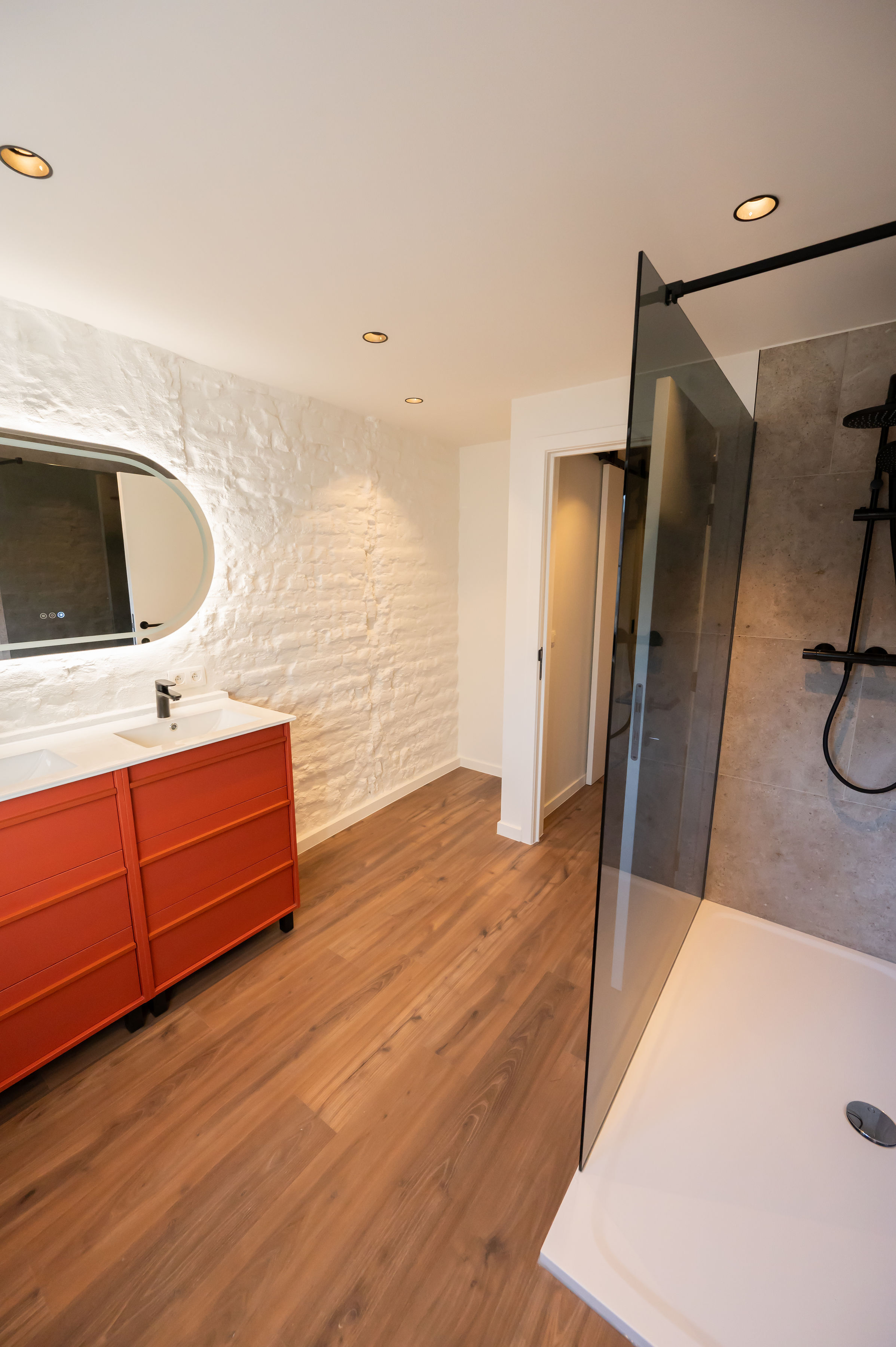 - Badkamer met ruime inloopdouche, dubbele lavabo, elektrische handdoekradiator en aansluitingen voor wasmachine/droogkast